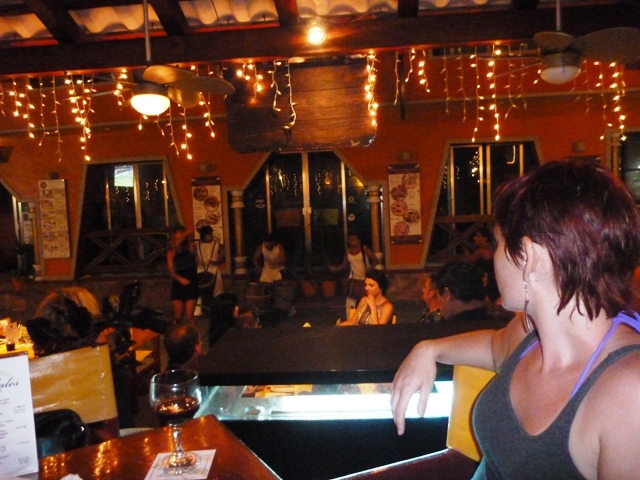 We didn’t have any trouble through the two borders or on most of the drive. It had gotten dark before we got into Cancun and it was about then, just before we got past the airport, that the steering went out and the rod dropped down creating a horribly jarring sound. We were forced to pull off to the side of the road that had no shoulder. Cars, buses and trucks were whipping by us while Scott was under the car trying to fix the problem. Ultimately he had to put it back in place using zipties so that we could limp to Puerto Juarez to get on the ferry to Isla Mujeres. We were a bit shaken up when we finally got over the ferry and onto the island so a mojito was definitely in order. After a drink we made our way over to Rishi’s island for the night.